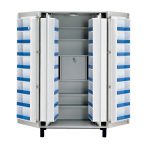 Carucior medicamente cu structura mobila din plastic, prevazut cu 9 sertare din care 6 sertare cu compartimente si 3 sertare cu compartimente blocabile cu ajutorul unei incuietori si doua masute glisante. Structura dotata cu sistem de protectie , maner din inox si patru roti din care 2 prevazute cu sistem de franare.